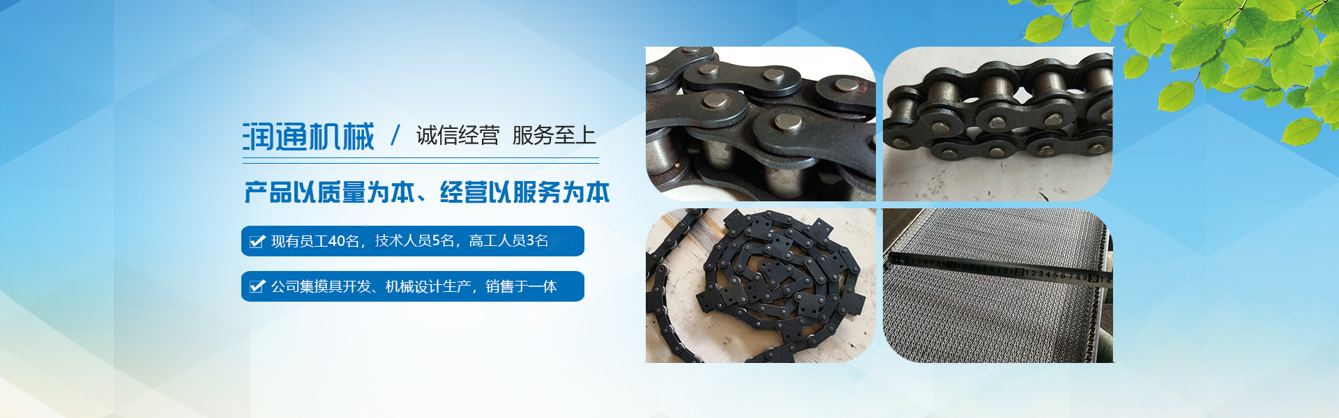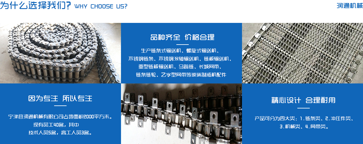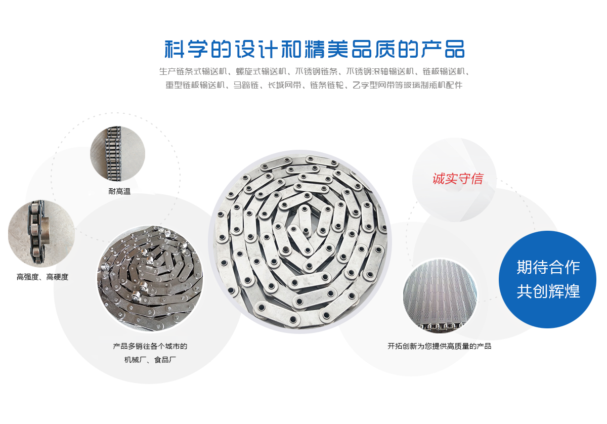 生产链条式输送机、螺旋式输送机、不锈钢链条、不锈钢滚轴输送机、链板输送机、重型链板输送机、马蹄链、长城网带、链条链轮、乙字型网带等玻璃制瓶机配件,食品机械配件及各种网带的专业厂家 ,多年来产品畅销各地玻璃厂和食品厂,在玻璃制品等行业中享有较高的声誉。公司集摸具开发、机械设计生产,销售于一体的生产型企业。生产的自动化流水线金属传动网带、链条等产品广泛用于玻璃机械、食品机械、化纤机械、医药、电子、烘干机械、轮胎机械等行业。产品多销往各个城市的机械厂、食品厂和一些涉及流水线或自动化设备的公司。